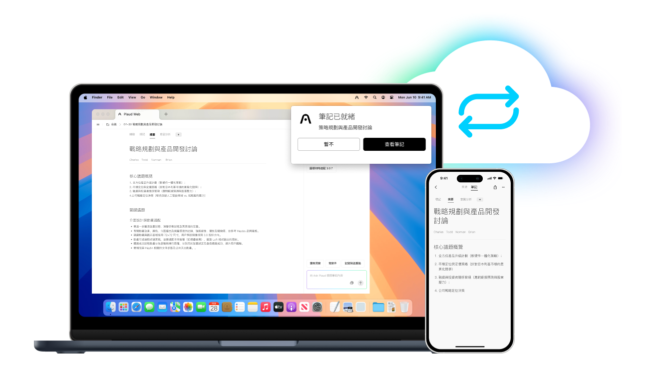 使用 Plaud AI 智慧筆記裝置錄音,並可在 App、Web 與 Desktop 上隨時存取錄音檔、逐字稿與重點摘要,所有資料皆安全儲存在雲端,享有無限儲存空間。