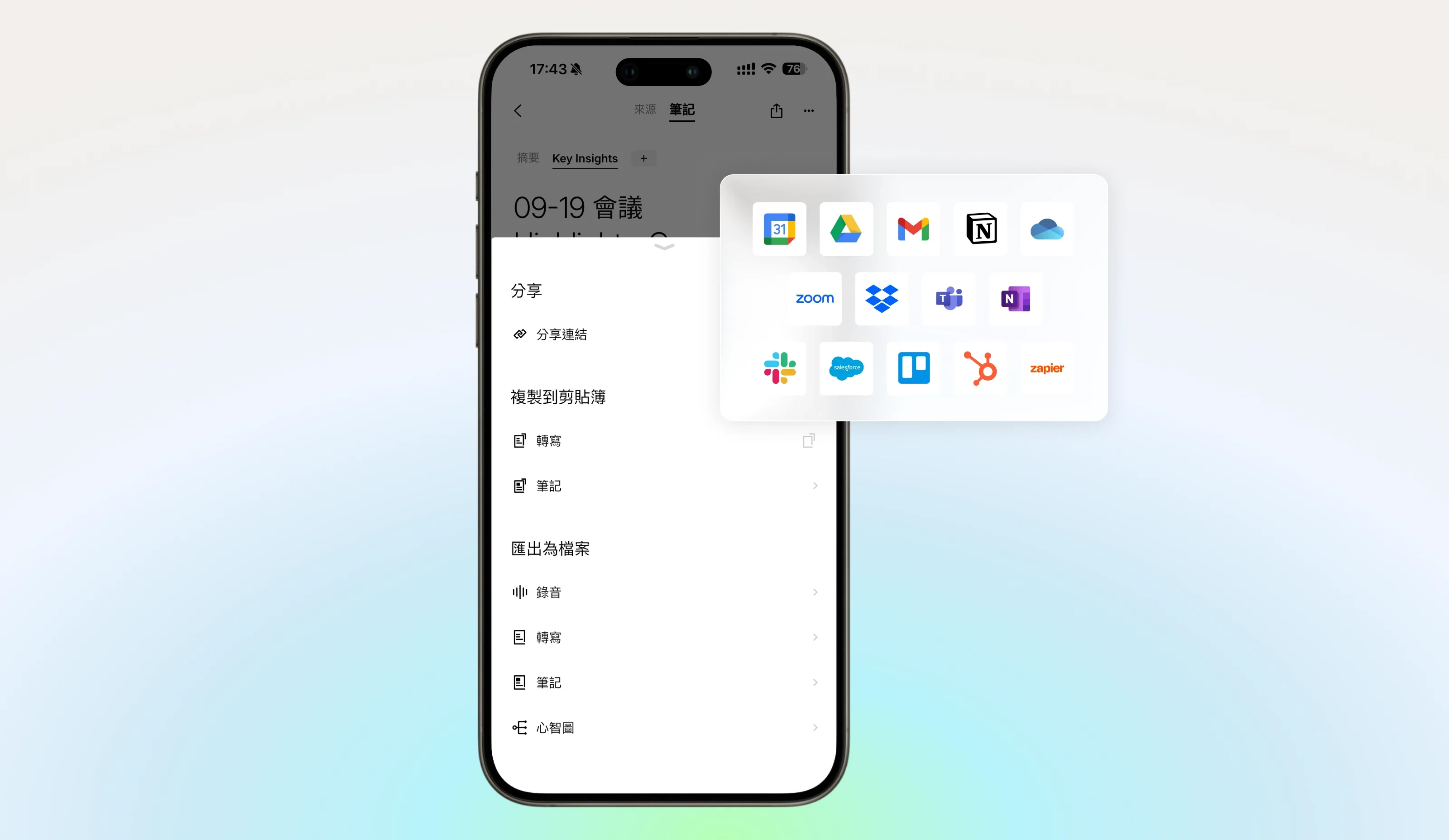 你可以完全掌控錄音、轉寫文本、摘要同心智圖嘅匯出;支持 27 種以上格式分享。